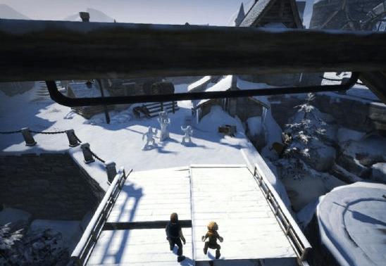 二 妹子练过功夫的,三两下就从树上翻过去了,两兄弟还在后面慢慢走呢。之后到一座城镇前,门口有很多被冻住的人,妹子又发号指令,叫两兄弟去把投石车推下来,两兄弟推下来后,妹子坐在投石车上,哥哥把她扔了进去,之后再把弟弟扔进去,弟弟去烽火台上的把手处把城门打开,进入城内后,触发剧情,一个隐身的巨人,剧情结束之后哥哥从前面的黄色把手处爬到弟弟这边(妹子直接跳过来的)之后妹子翻到弟弟这边的一扇门内开门,之后巨人从下面绕上来了,妹子叫两人跟前面雪人的动作保持一致,巨人就不会发现了。之后妹子会帮兄弟二人清楚障碍,站在高台上等就行了。