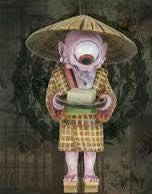 外形娇小可爱,带着帽子,上面有一只眼睛,能看得很远。喜欢恶作剧,比如把书卷翻开再合上,如此反复直到书卷破破烂烂为止。一目小僧原是脸上只有一目的妖怪,图中的是由江户时代流传下来的形象。