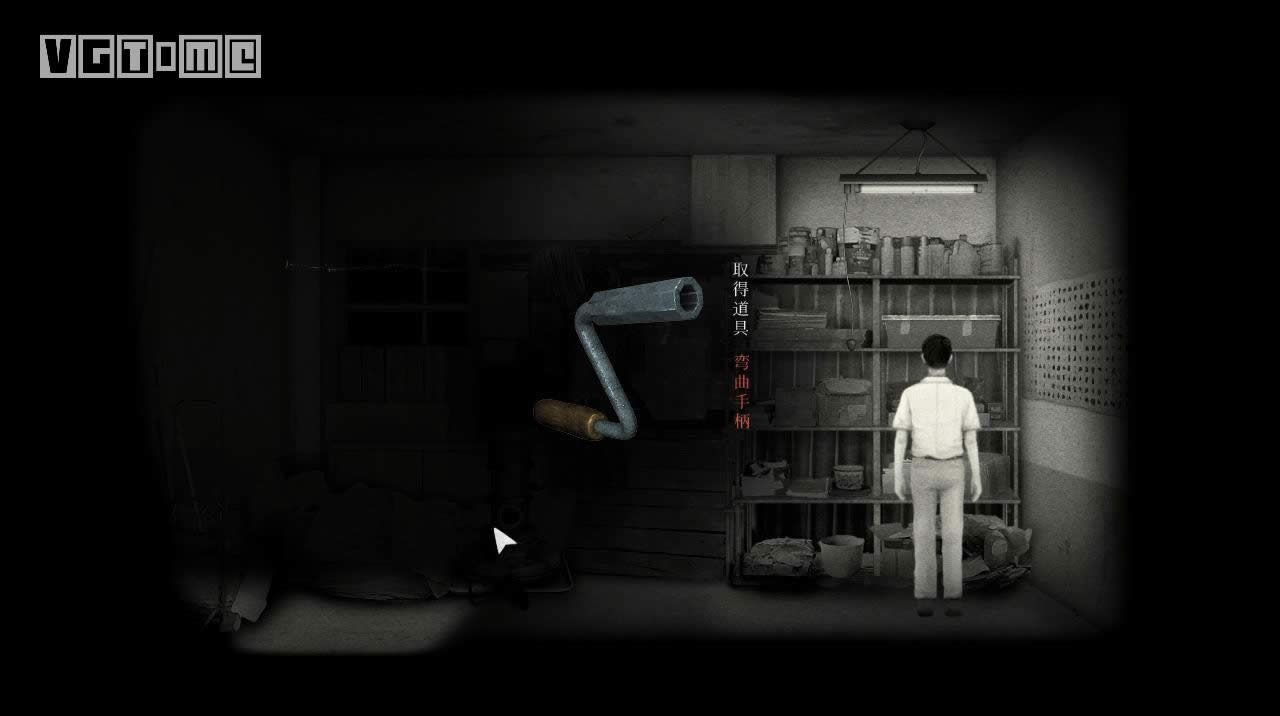 在卷帘门右侧有一个装置,需要找到道具才能打开。一旁的工具间里就可以捡到“弯曲手柄”。