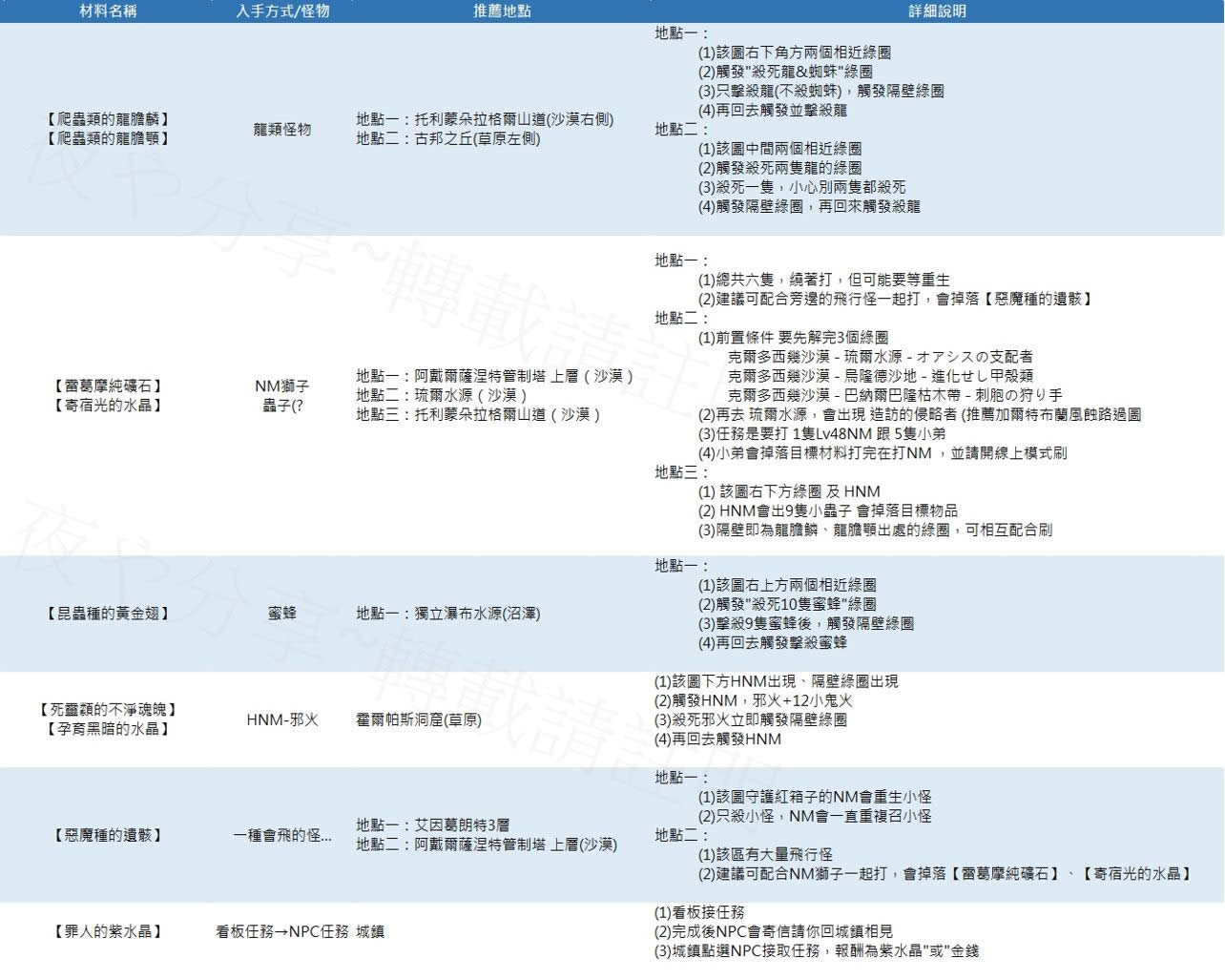 近期已经越来越多玩家再拼传说武器,至于材料也有很多方法入手,所以趁著上班时间整理给大家参考,当然内容会以"较困难"掉落的材料为主。