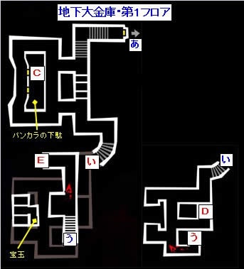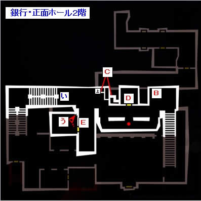 B点通过墙上的洞来到旁边的房间,う点处通过电梯来到最下层,之后一路通过楼梯来到最下层,在 D 点 BOSS 战。