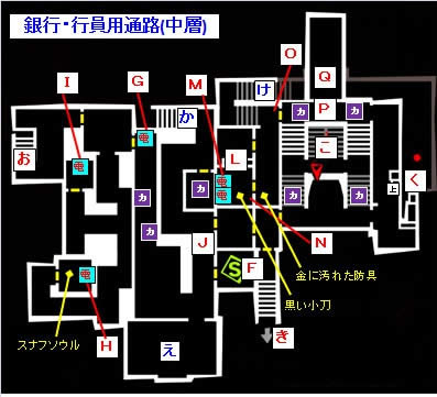 前往西侧 E 处的电梯用钥匙卡进入,从大洞处跳下,来到银行员用通路下层和中层。