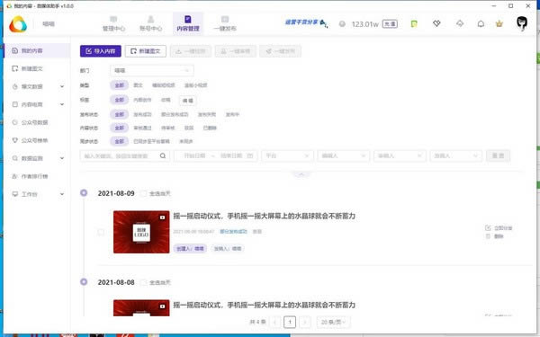 [摘要]自媒体助手是一款新自媒体高管理工具,可以将图文、视频一键分发上传至60+自媒体、短视频平台,支持1000+账号管理、团队管理等八大特色功能如果你是团队协作还可以分权管理,对文章编缉、发布、审核、帐号...
