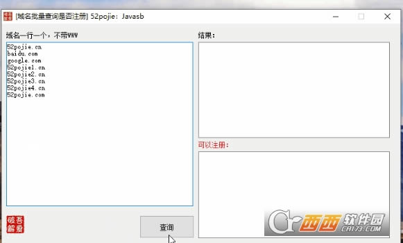 域名批量查询是否注册是一款简单实用的用于查询域名注册信息的工具,它可以帮助需要注册域名的用户批量查询可注册的域名,支持查询结果和可注册分区域展示,更直观,极大的方便了用户的查询工作,操作简单,使用便捷,非常好用。