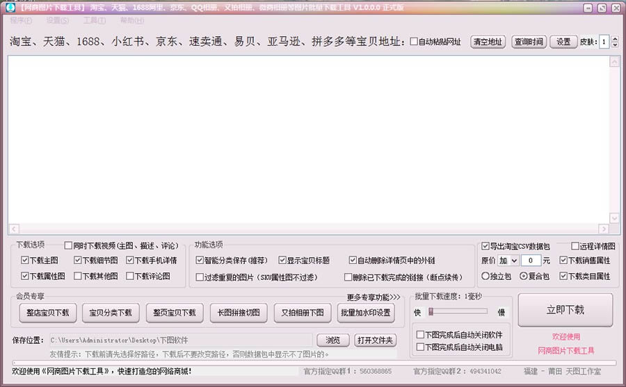 网商图片下载工具是一款专业的图片批量下载软件,网商图片下载工具用于批量下载网店中商品图片和视频,也用于批量下载各大相册的图片素材,目前已支持100多个平台的图片下载,以及部分平台的视频下载,一键复制图片,智能分类保存。可以整店、整页或选择需要的分类下载,同时还有边下载边添加水印、智能拼接成长图、智能断点续传、智能过滤重复图片等等的人性化功能,而且还可以将淘宝、天猫、京东、阿里的商品导出CSV数据包,导入淘宝助理后只要稍微编辑就可以轻松发布宝贝,是网商卖家必备的好帮手。