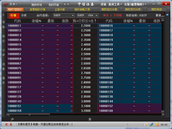中信证券股票期权交易系统是本公司为广大投资者进行股票期权交易提供的网上交易平台。该软件提供了最快最全的期权行情、期权双向报价及资讯等附加功能。在交易方面,除提供基本开平仓交易、划转和查询功能外,还提供了快速下单操作。推荐参与股票期权业务的投资者使用。