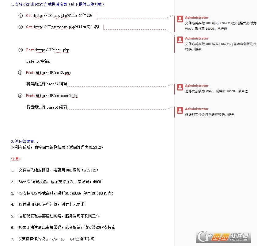 软件可以采用Get和Post方式,去提交一个60秒以内,WAV音频,采样率为16000,单声道的文件,识别速度快,接入简单!