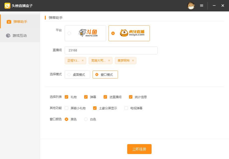 头榜直播盒子当前上线弹幕助手功能,弹幕助手支持斗鱼和虎牙两大直播平台,同时支持桌面模式和窗口模式方便用户根据不同直播场景切换不同使用模式。