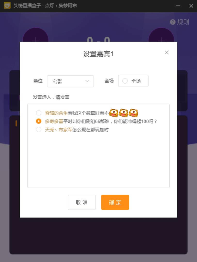 如:今天是用户“多寿多富”要点灯,则让多寿多富发弹幕,然后选中弹幕 确定就可以,另外一边选择全场;