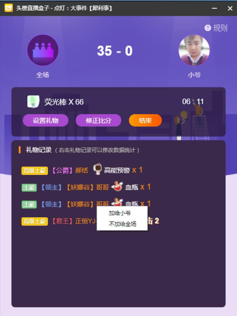 如图:【妖娜谷】哥哥的礼物原来是加个全场的,但是要改成加给“小爷”可以右击礼物记录加给小爷,如果不算的话可以选择不加给全场;