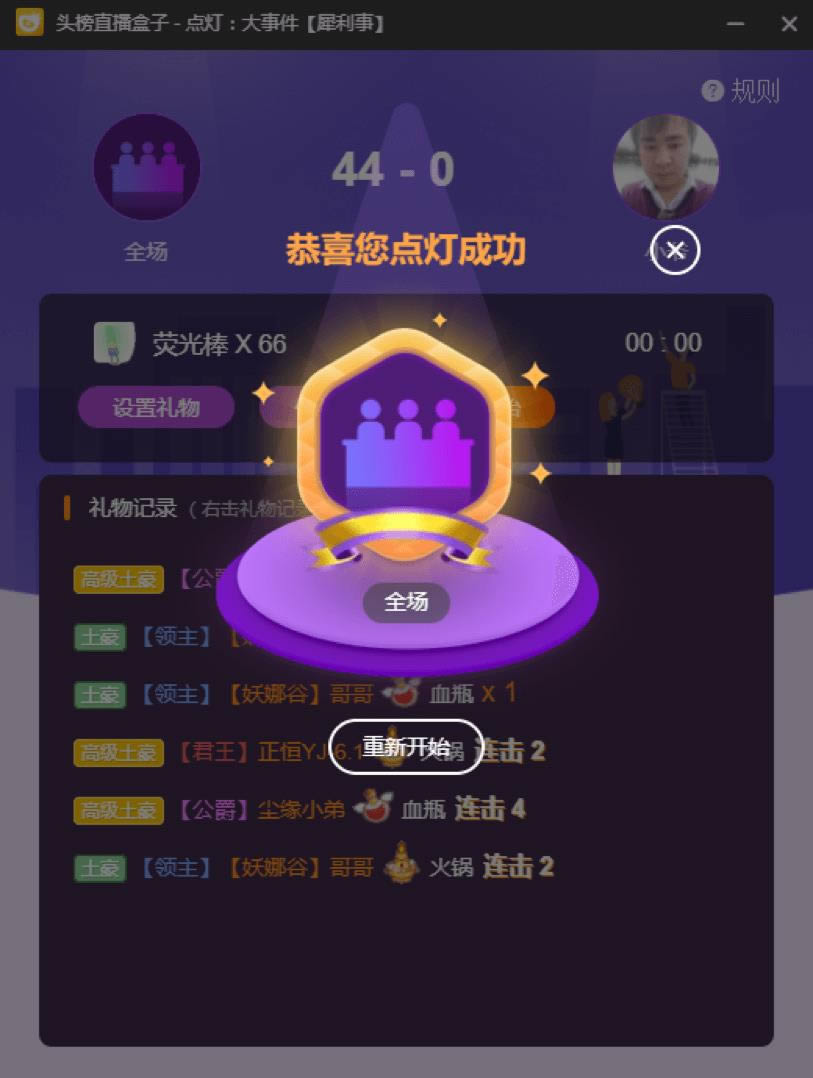 设置点灯的礼物,选择礼物(如荧光棒)设置礼物数量(如66个)
