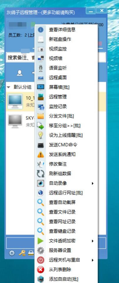 [摘要]灰鸽子远程控制软件是一款可穿透防火墙的远程控制软件,灰鸽子远程控制软件支持IOS MAC 安卓 控制电脑但手机版还没有开发。灰鸽子远程控制软件是由潍坊灰鸽子安防工程有限公司开发,可对员工计算机进行全...