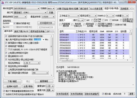 stcisp软件主要针对超高速STC15系列1T 8051单片机进行烧录与设计,不需外部晶振,不需外部复位,通过STC-ISP自带的烧录工具就能很好的完成所有设计工作,让您在仿真的过程中得到更加方便的操作平台,可以选择单片机的型号、串口号、最低波特率、系统频率等参数设置。