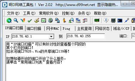[摘要]啊d网络工具包是与啊d注入工具同类的SQL注入工具,一款很简单的网络检测助手,利用“IP端口”扫描可以用针对性的查看整个网段的某个打开的软口,随时随刻的知道自...
