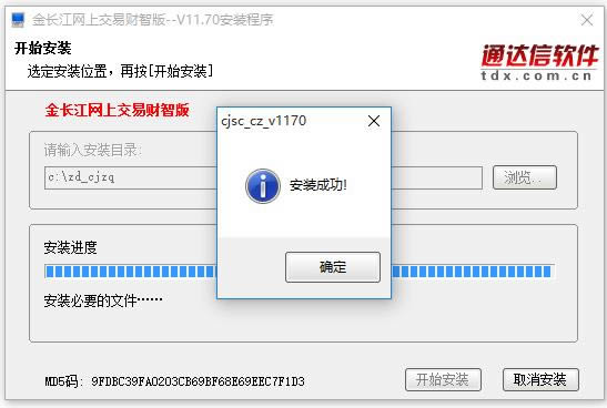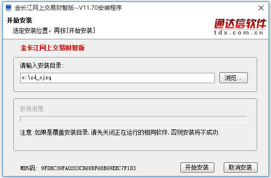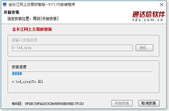 下载金长江网上交易财智版,解压压缩包,双击.exe文件,弹出界面,选择软件安装路径,点击【开始安装】,