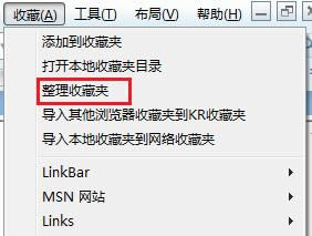 KR和IE共用收藏夹,IE的收藏夹就是KR的收藏夹,收藏夹排序,需要通过点击【整理收藏夹】来拖拽排序