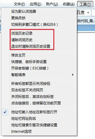 在软件右上角,有个“工具”按钮,点击后,出来的菜单有个“浏览历史记录”、“清除历史记录”等菜单.