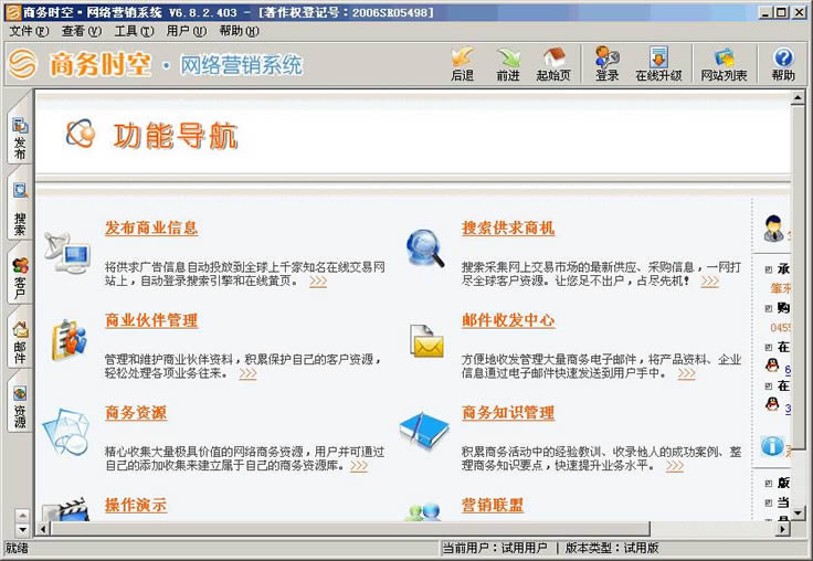 [摘要]商务时空十大功能1商业信息发布:将您的产品/服务信息免费投放到全球上千家知名网上交易市场.2商业情报搜索:从全球著名商贸网站上搜索大量的买家信息.3网络黄页登陆:将公司信息添加到上千家网络黄页,发掘...