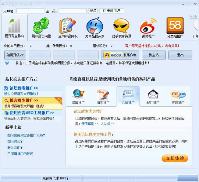 淘宝推广大师是一款部分功能免费的淘宝客推广工具,淘宝客推广大师分为本地和网络优化2个主要功能。同时提供博客推广,论坛推广,店铺打标等多种营销扩展。淘宝推广工具包括网站推广,博客推广,论坛推广,留言推广等高效推广方法,可以给淘宝客推广者带来有效的成交客户。本地优化通过代理服务器方式模拟不同机器环境来刷网站流量和排名,按照访问的越多越靠前理论设计: