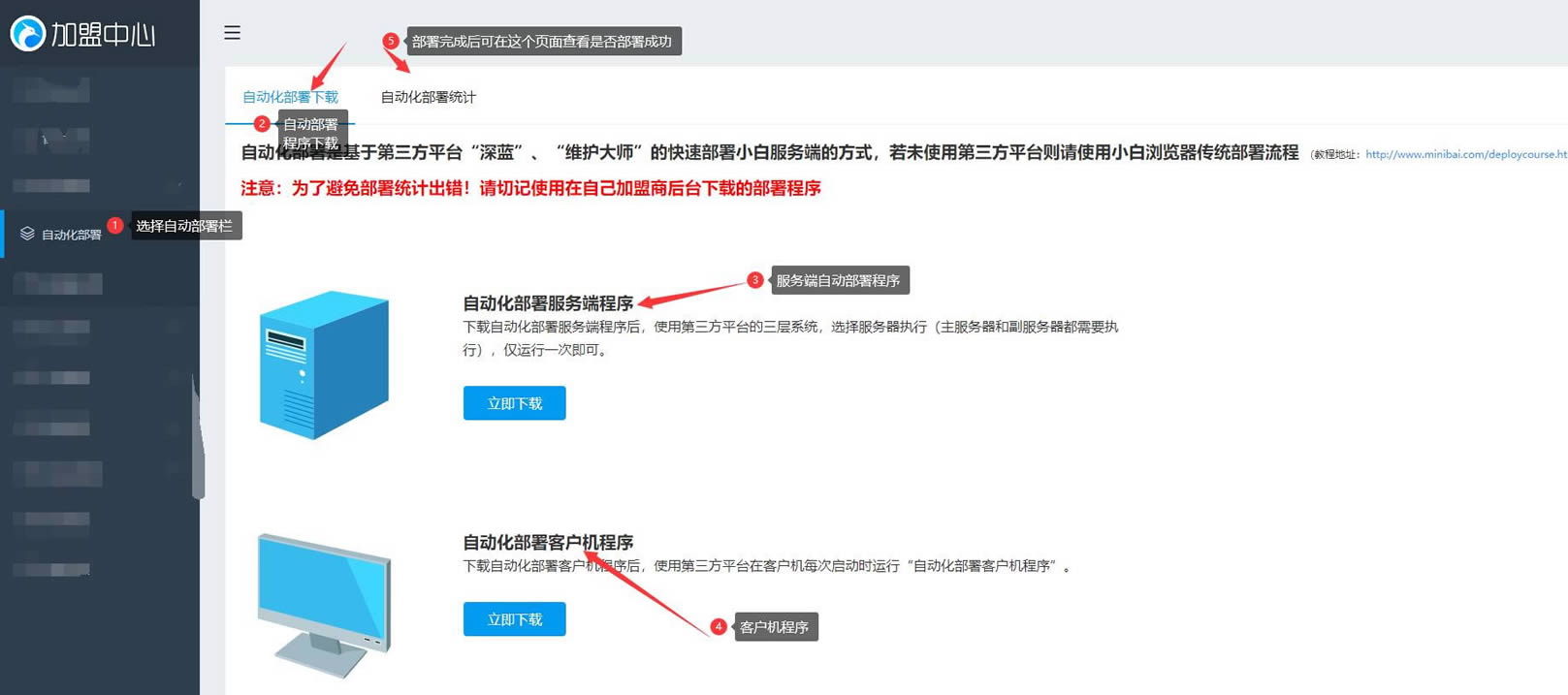 答:在加盟商后台(jms.minibai.com)自动部署下载服务端和客户端自动部署程序后,上传至服务器上,先安装服务端自动部署程序,完成后,等待同步浏览器目录完成之后通过第三方下发通道下发客户端程序