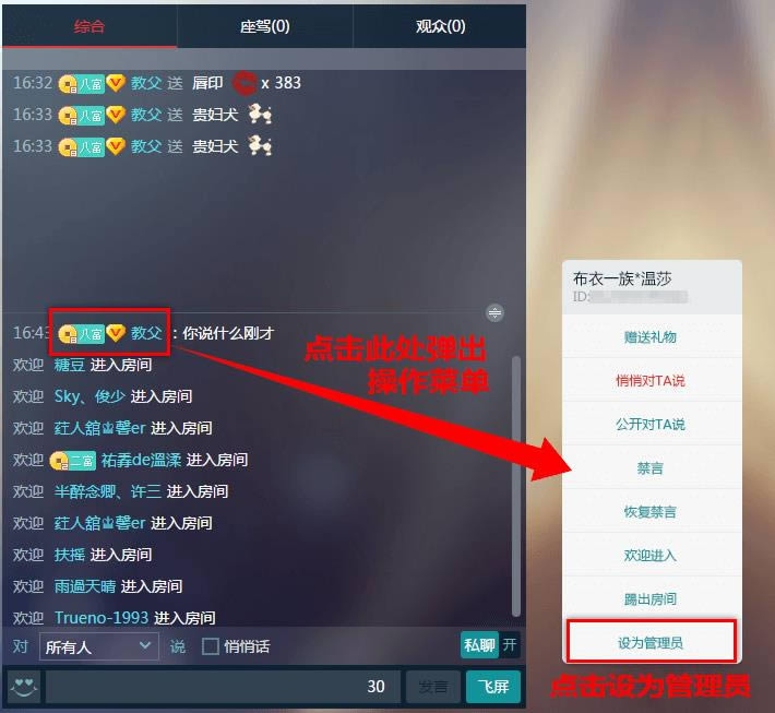 单击用户头像或者名字,会弹出操作菜单,点击“设为管理员”