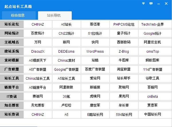 起点站长工具箱是一个用.Net制作的站点综合信息查询工具,主要功能是查询某个站点的Google Pagerank、Alexa世界排名、Sogou指数、中国网站排名,以及在几大主要搜索引擎中的收录反向链接的情况。