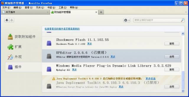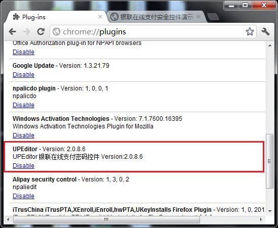 2、在“插件”列表找到【UPEditor】,如果显示【已停用】,请点击【启用】,启用后,重新访问银联在线支付网站或重启浏览器后再次登录。