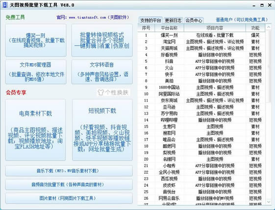 天图视频批量下载工具是款支持批量操作的视频下载工具,包括淘宝、京东、亚马逊等网购店铺的主图视频、描述视频;快手、抖音的APP短视频,并具备自动去水印、视频合并、MD5修改等功能。