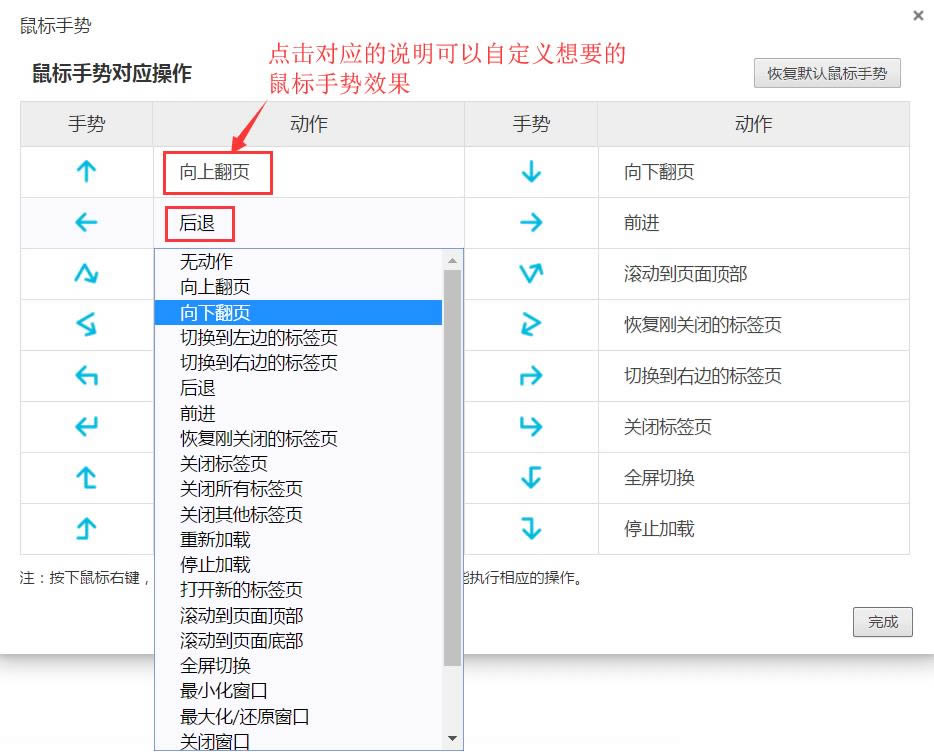 按下鼠标右键,滑动鼠标,画出以上图形,释放鼠标右键后就能执行相应的操作。进入“设置”页面,在勾选“启用鼠标手势”的情况下,鼠标手势才会生效。
