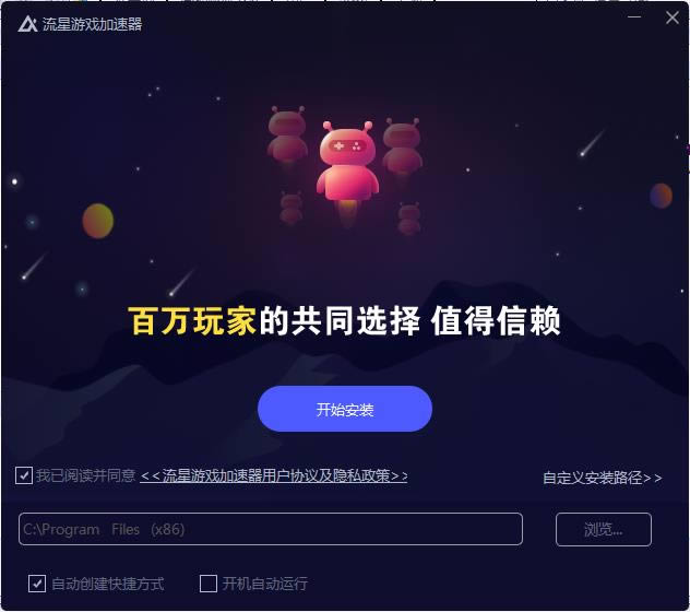 1.到本站下载安装流星游戏加速器,打开安装程序,点击自定义安装路径选择软件安装位置,开始安装