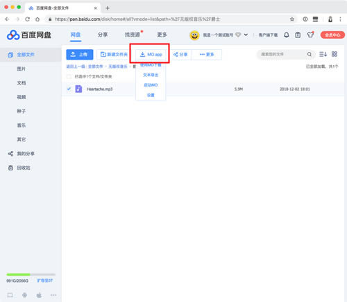 6.打开百度网盘网页版,如果页面弹出“初始化成功!”的提示,并且在你的百度网盘网页版界面上还会出现一个「MO.app」的按钮,就说明浏览器扩展安装成功了。