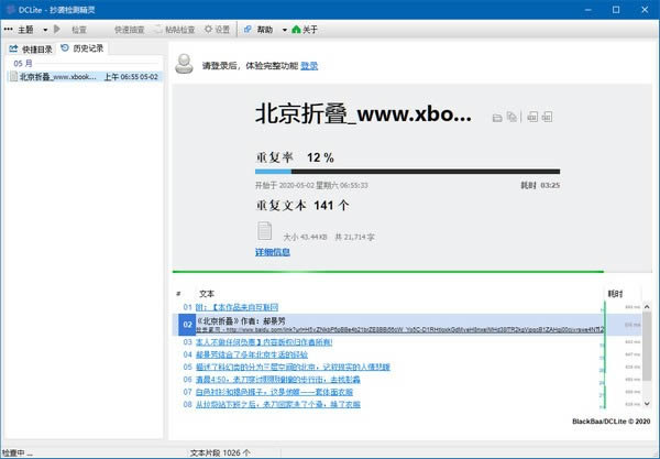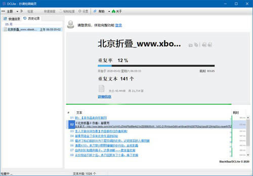 DC lite抄袭检测精灵是款简单准确的文章查重软件,支持百度、搜狗等多个搜索引擎,不限于内容类型,小说、论文等任何形式的文字都可以,速度快,轻松得出重复率。