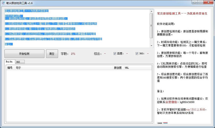 - 综合原创度功能:综合原创度综合了百度和360搜索引擎,两个原创度的综合平均值