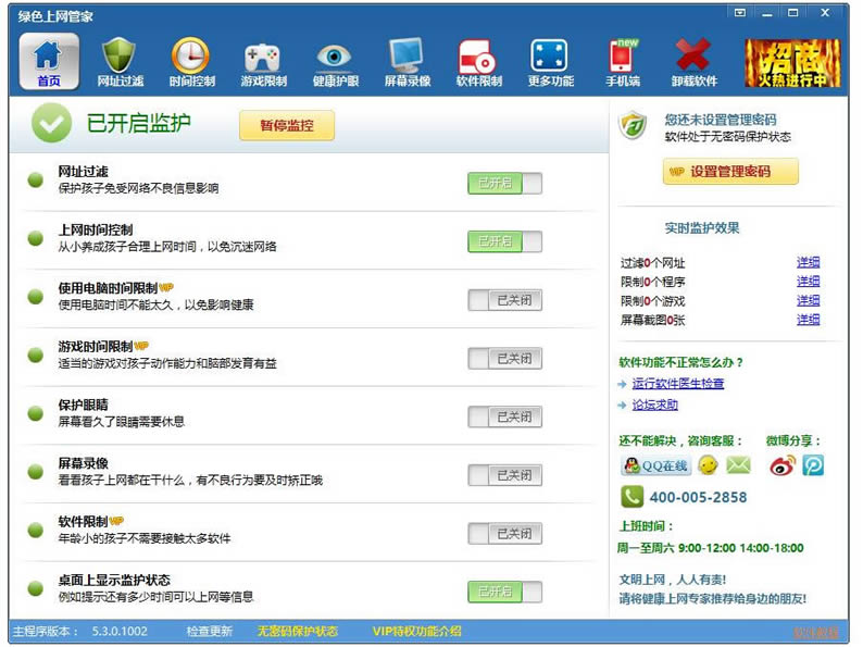 绿色上网管家有着超强的保护,除非知道密码才能卸载,否则无法删除破坏本软件。