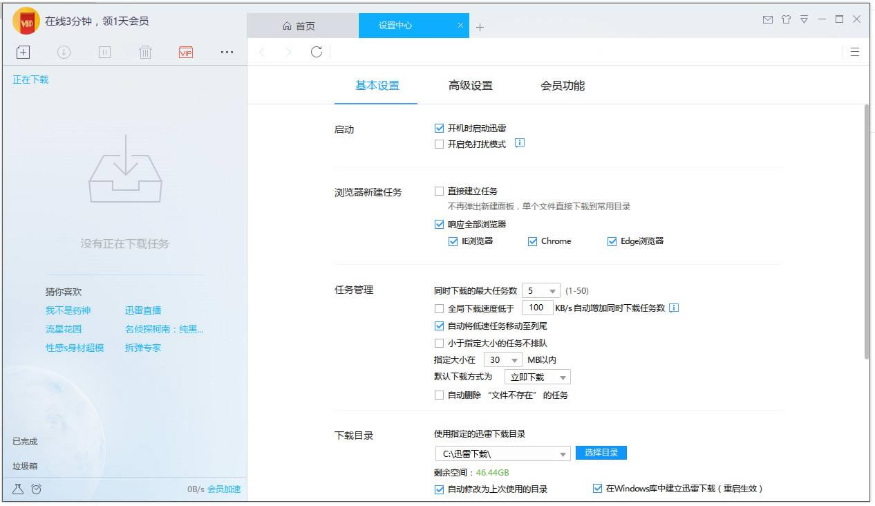 - 迅雷9的主界面分为左侧的“下载管理”区域和右侧的“浏览器”区域。