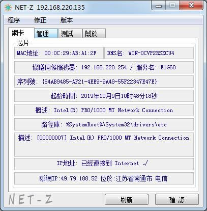 [摘要]NET-Z是款简单好用的网卡网络管理工具,实时查看系统网卡各种硬件信息、对网络状况进行测试管理、自动快速设定DNS信息,并提供系统网卡的维护和更新。NET-Z功能网卡硬件真实讯息一览无余。简单明了的...