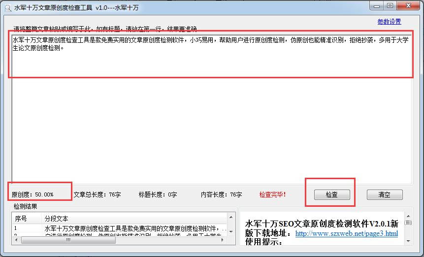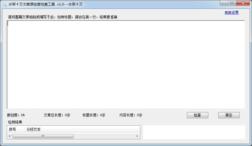 水军十万文章原创度检查工具是款免费实用的文章原创度检测软件,小巧易用,帮助用户进行原创度检测,伪原创也能精准识别,拒绝抄袭,多用于大学生论文原创度检测。