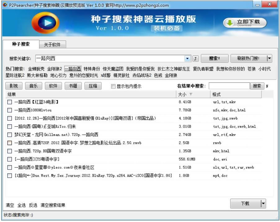 种子搜索神器云播放预览版,这是结合了云播放功能的ED2K资源跟电磁资源的搜索利器,搜索出来的资源可以用电驴或者迅雷下载工具下载,绝对是宅男福音!