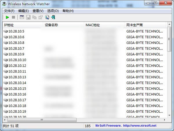 Wireless Network Watcher是一个可以扫描你的无线网络,并显示目前连接到网络的所有计算机和设备的清单的无线网络用户查看软件。运行 Wireless Network Watcher 之后,点击「开始扫描」按钮,软件便会自动扫描整个局域网网段的IP (默认从192.168.1.1到192.168.1.255,你也可以自己指定范围),然后软件就会把全部连接上的网络设备(包括手机、电脑、平板、游戏机等等)的IP地址、MAC物理地址、制造厂商等信息列出来。一旦发现有陌生设备,可以立即通过路由器设置,将该设备的MAC物理地址加入黑名单,或者更换WIFI密码来阻止他人继续蹭网。Wireless Network Watcher 为每台计算机或设备连接到网络,显示了以下信息:IP地址,MAC地址,该公司生产的网卡,并选择性的计算机的名称。您还可以导出成HTML / XML / CSV /文本文件连接的设备清单,或复制清单到剪贴板,然后粘贴到Excel或其他电子表格应用程序。