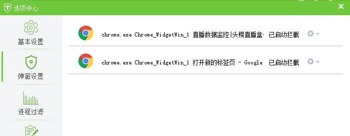 3.点击弹窗拦截,你刚才选中的窗口就在其中,标明以启动拦截