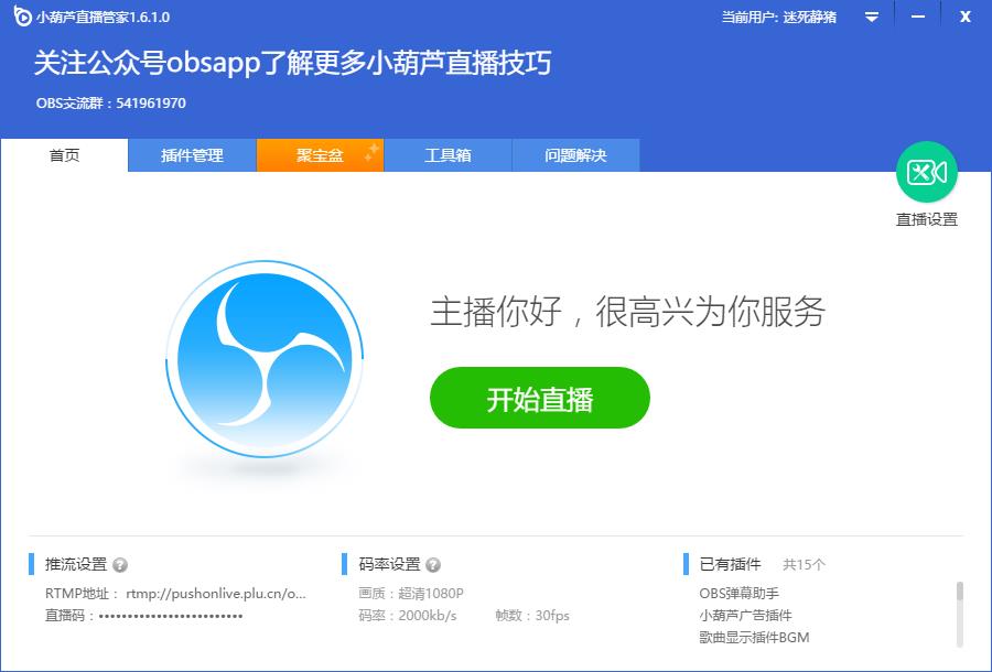 小葫芦直播管家是一款功能全面的便捷直播助手软件。软件内集成了原版OBS直播程序、弹幕助手等各类插件、测速修复等小工具,提供给主播一站式下载的服务,省去查找的烦恼;同时小葫芦直播管家研发了一键直播功能,新人主播仅需要填写直播平台及串流码即可一键开播,省去学习OBS的时间,大大降低直播门槛!近期小葫芦直播管家又新上线聚宝盆功能,所有主播都可以通过该功能,以完成任务的形式,简单而有效地实现自我商业价值的挖掘。