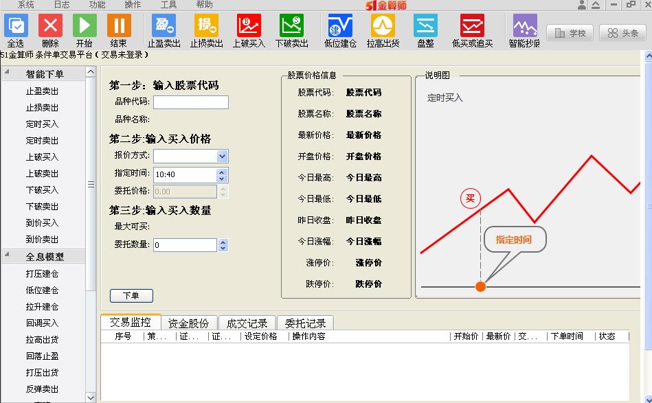 51金算师有丰富的价格条件单与时间条件单,让您做到无须盯盘、自动下单,止盈卖出让您不再坐电梯,止损卖出让您不再深度套牢,低位建仓让您赢在拐点,上破买入让您能够追涨停!