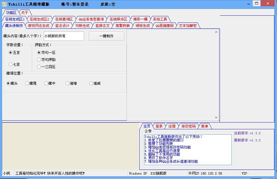 [摘要]Ychilli工具箱是一款个人开发的开发软件工具箱,具有非常实用的功能,部分功能需要注册登录才能使用,一些常用的功能可直接使用,非常方便。功能说明游戏网名生成功能可用,轻松一键生成1000个网名签名...