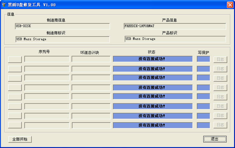 黑雨U盘修复工具是款可以查看U盘性能的工具,按信息状态,如制造信息、产品信息、制造标识、产品标识和序列号、坏道总计块、链接状态、写保护,并能一键修改U盘。可修复无法打开的优盘和无法检测到的U盘。