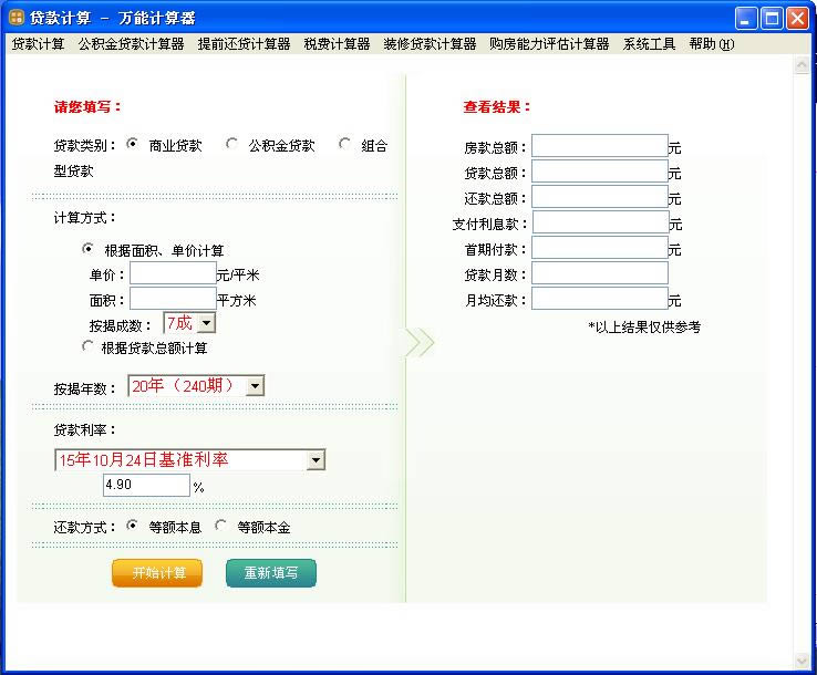 [摘要]万能计算器打破传统计算器模式集合很多功能于一体,让繁杂的计算完全在您的掌控之中!主要功能为您提供了非常实用的计算功能,包含了房贷计算器,公积金贷款计算器,二手房贷款计算器,存款利率计算器,车贷计算器...