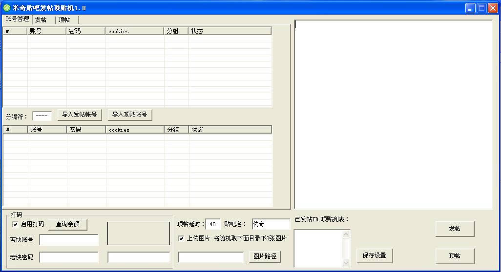 7、账号管理:支持多账号轮流使用。发帖账号和顶贴账号最好不要相同,实际使用过程中特别是挂机的时候,可以重复多导入几次,执行时会随机抽取,如果被封会忽略不使用。