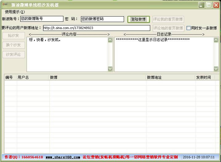新浪微博单线程沙发机器是一款新浪微博群发顶贴器,可批量处理您的微博消息,一键转发,更有抢沙发的功能,玩转微博,助您成为微博达人. 新浪微博群发顶贴器需要您的个人账号和密码登陆您的主页,然后可以遍历您的个人主页最新的微博并对他们批量评论因为是程序自动评论的,两次评论间的耗时仅为几毫秒,所以会被微博认为是刷评器,一般评论七八条就不能在评论了。