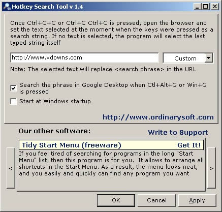 Hotkey Search Tool 是一款网络辅助工具,可以选择短语和按下热键,它将与选定的文本搜索结果打开一个浏览器窗口。这节省了时间,作为搜索结果只是一个热键消失。您也可以使用该程序用于其他目的。您可以配置程序来搜索百科全书,电影或法律数据库和更多。热键的搜索工具,还可以方便地与谷歌桌面的工作。