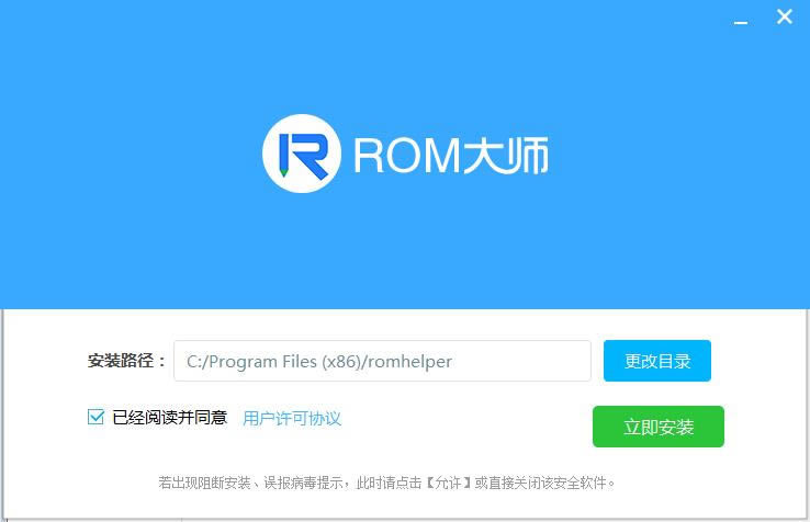 1.到本站下载安装ROM定制大师,打开安装程序,点击更改目录选择软件安装位置,点击立即安装
