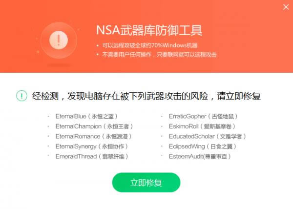 - EternalChampion(永恒王者):SMBv1漏洞攻击工具,影响全平台,已被微软补丁MS17-010修复。在微软支持期的系统可使用360安全卫士检测修复漏洞,不在支持期的系统可使用360“NSA武器库免疫工具”进行免疫;